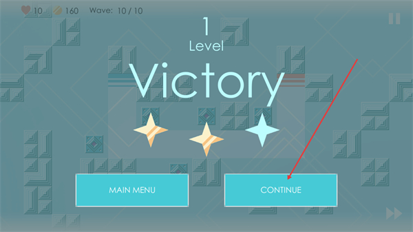 4、通关当前关卡显示Victory后,点击界面中的CONTINUE按钮,即可进入下一个关卡继续挑战,点击MAINMENU可返回主菜单。