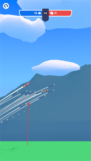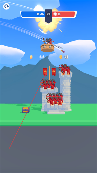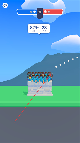1、操控蓝色弓箭兵,调整至87%28°角度发射箭矢,攻击敌方红色堡垒,积累攻击进度。