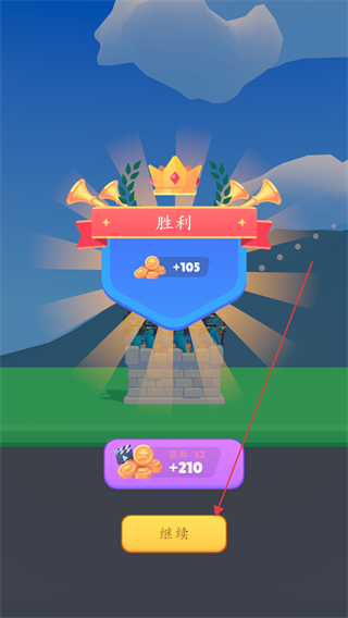 4、关卡显示胜利,获得金币奖励,点击继续进入下一关。
