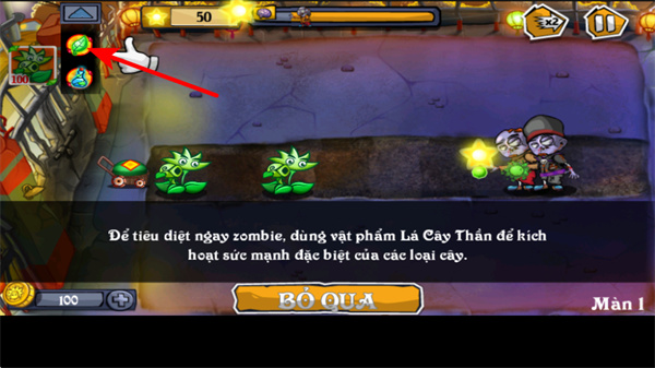 4、按照指引点击左侧箭头指示的道具,触发植物的特殊能力,这是击败僵尸的关键操作,可强化植物战力。
