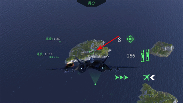 4、攻击目标,在飞行过程中,瞄准岛屿上的目标区域,发起攻击,完成战斗任务并获取得分。