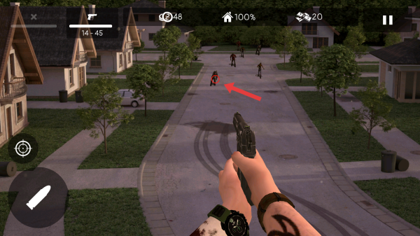 1、在僵尸射击游戏中,操控手枪瞄准并射击远处的僵尸,通过精准射击可快速消灭敌人,保护家园,维持100%的家园完整度。