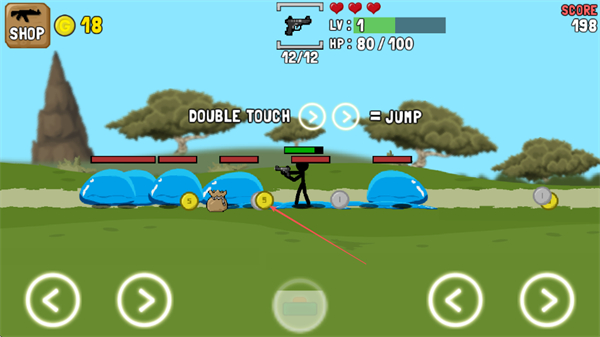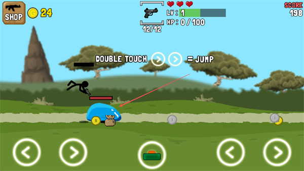 以简洁火柴人形象设计角色与敌人,搭配清晰横版场景,画面风格轻快,让注意力更集中在射击操作上。