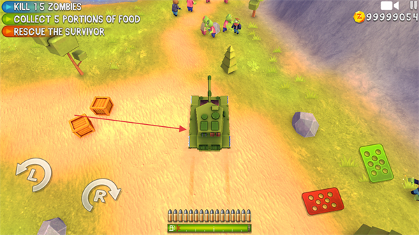1、操控坦克移动,先靠近木箱区域,推进收集食物、击杀僵尸的任务进度。