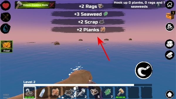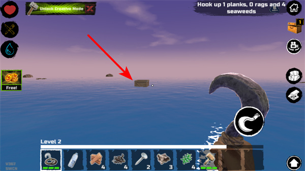 使用挂钩捕捉海上漂浮的碎片、藻类、盒子等各类资源,不同资源有不同获取难度,合理规划收集优先级,为生存提供物资保障。