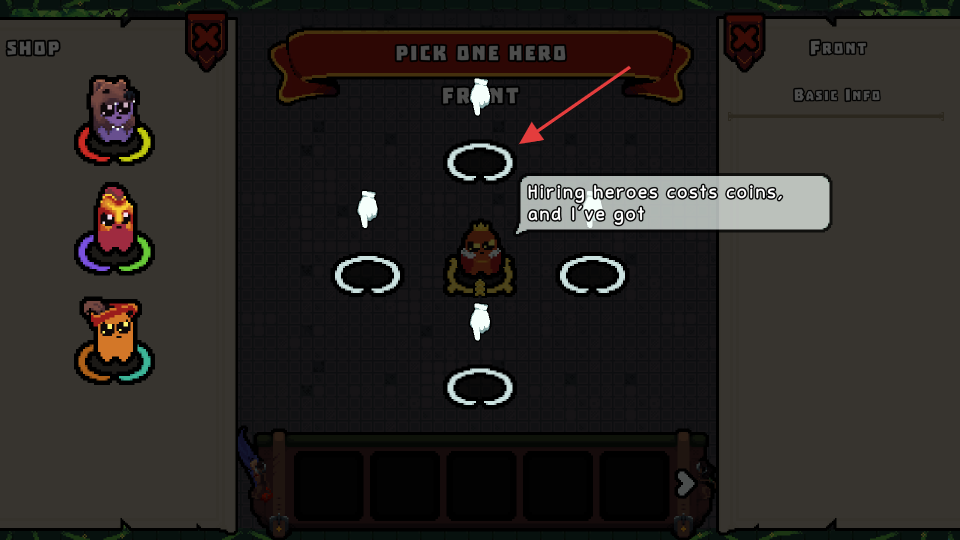 1、在英雄选择界面,点击箭头指向的英雄空位,花费金币雇佣新英雄,能组成更强队伍,参与战斗获取经验,加快升级速度。