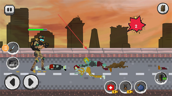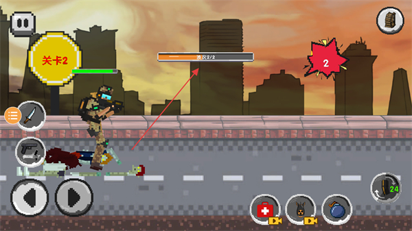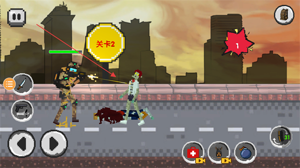 1、在关卡2中用冲锋枪射击僵尸,配合道具清理敌人,推进战斗。