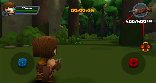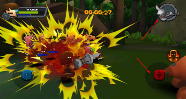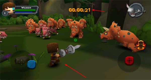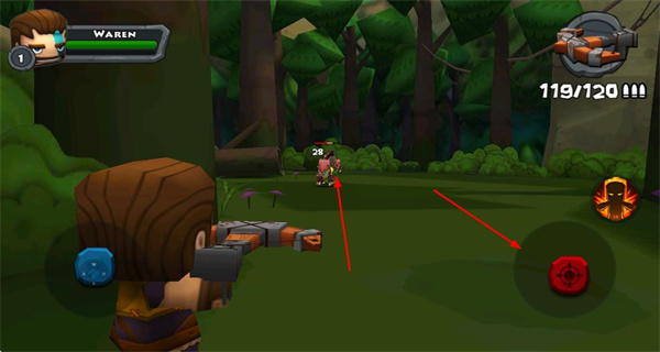 1、进入丛林场景后,操控角色Warren,点击右侧红色攻击按钮,瞄准并射击怪物如粉色恐龙。
