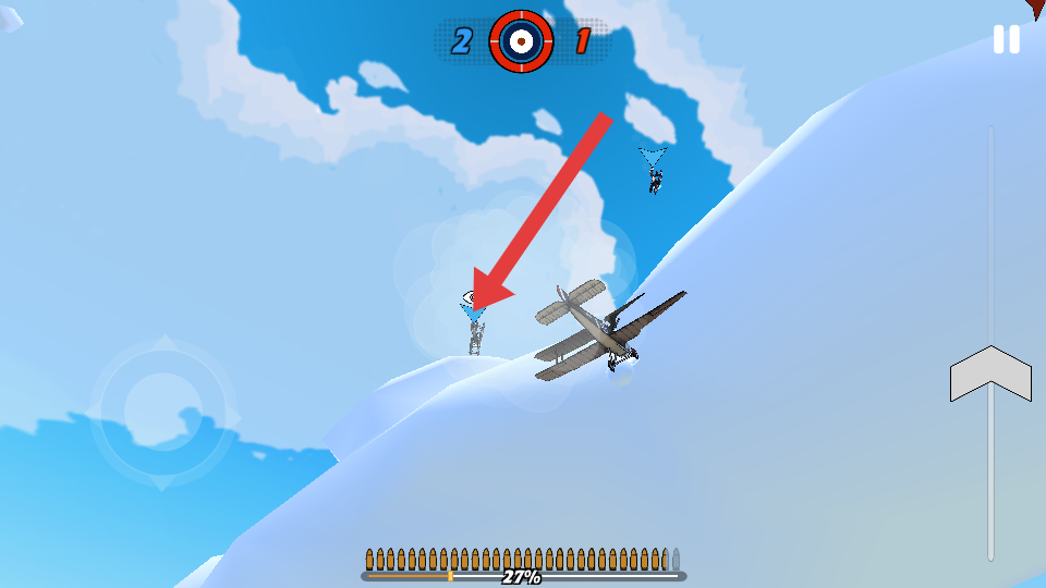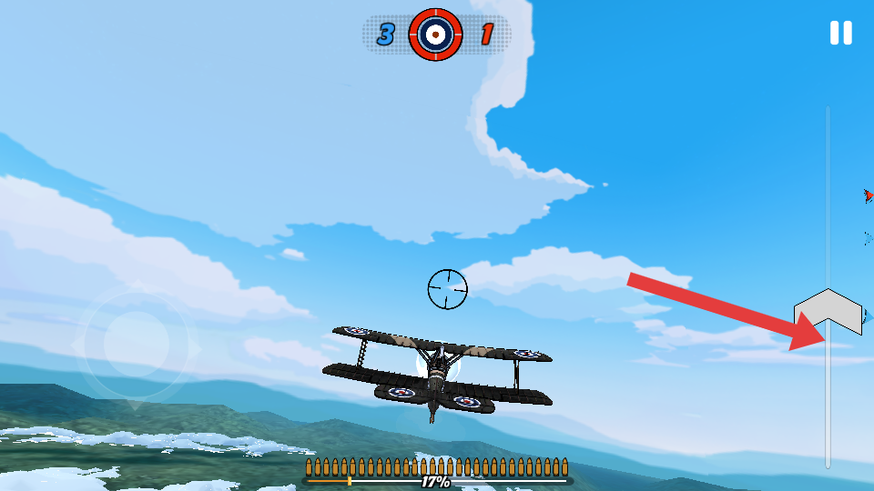 1、在空战游戏中,操控双翼飞机在空中飞行,通过右侧的方向指示调整飞行方向,这是任务基础操作。