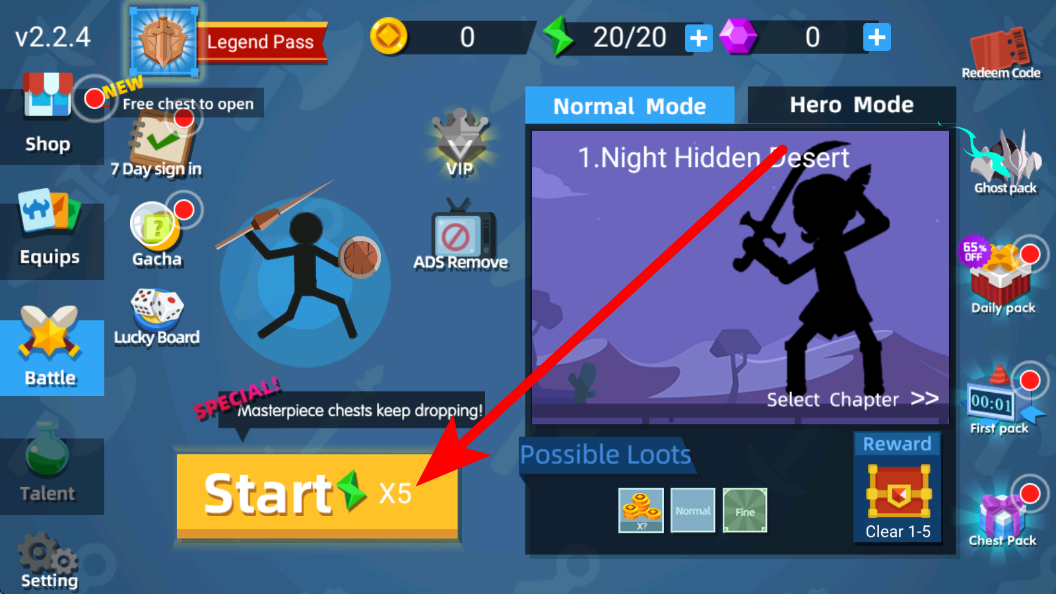 1、新手玩家首先开启战斗,在主界面找到Start按钮,点击后消耗对应资源,即可进入战斗关卡,开启与敌人的对战之旅。