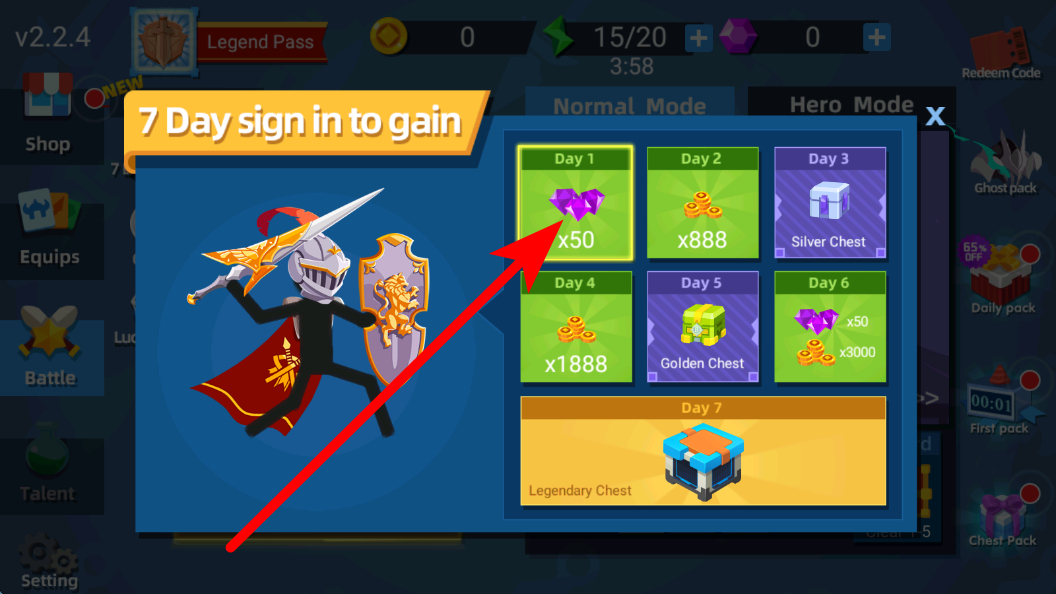 4、最后参与签到,在界面找到签到相关入口,每日进行签到,可获取宝石、金币、宝箱等奖励,积攒资源助力角色养成与战斗。