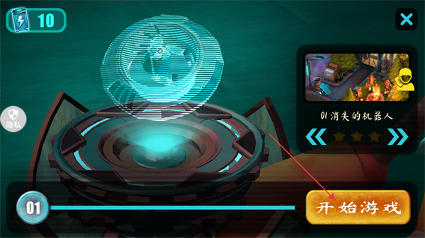 1、这是关卡选择界面,当前选中01消失的机器人关卡,界面显示体力值为10,点击开始游戏按钮,即可进入该关卡的游戏流程。