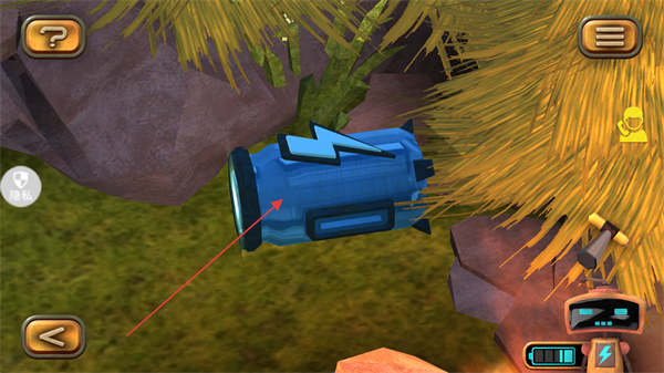 3、场景中出现带有闪电标识的蓝色道具,点击该道具,可完成拾取操作,该道具是机器人的主要食物资源。