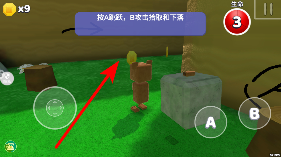 2、然后收集物品,在场景中发现金币、红心等物品时,靠近并获取它们,金币可用于后续兑换等,红心能提升生命数量。