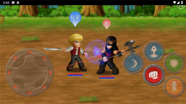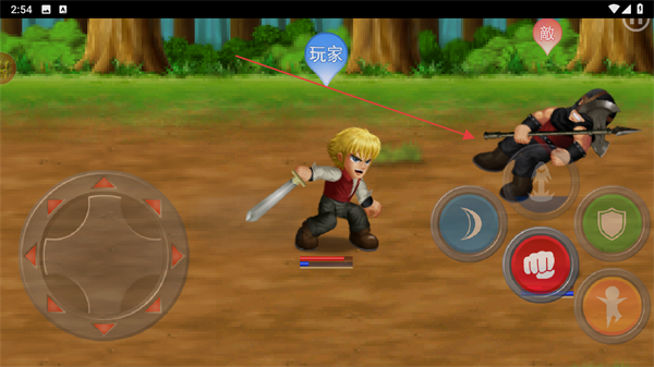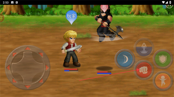 1、操控玩家角色移动,点击技能按钮攻击敵角色,开启对战。