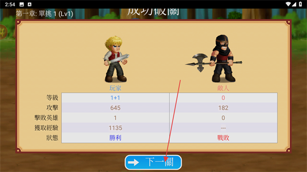 4、战斗胜利后查看结算界面,点击下一關进入下一个关卡。