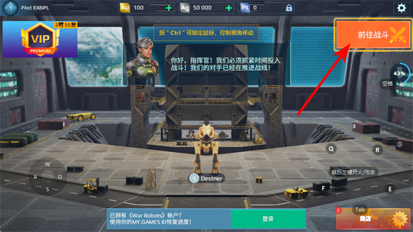 1、在准备界面点击前往战斗按钮,这是进入机甲对战的关键操作,点击后会开启战场场景,展开机甲战斗的核心体验。