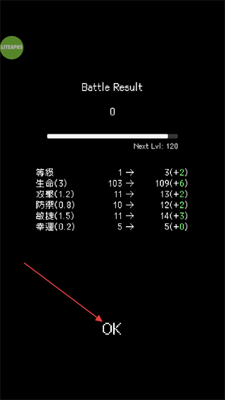 4、战斗结束后进入BattleResult界面,查看等级及属性成长变化,点击界面中的OK按钮关闭界面,回到游戏场景。