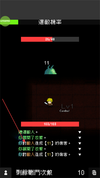 3、战斗中会遭遇敌人,角色自动展开攻击,界面会显示你对敌人造成11的伤害等信息,持续攻击直至击败敌人。