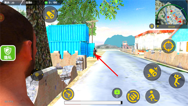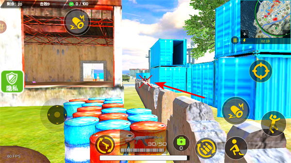 2、在场景中观察敌人动向,利用如围墙、集装箱之类的掩体躲避攻击,这是保障生存策略,需关注敌人的位置和攻击节奏。