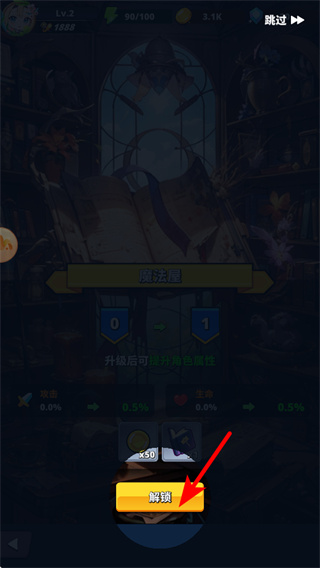 3、在技能升级界面点击解锁按钮,这是强化技能效果的核心操作,消耗后技能会获得属性提升,在战斗中的作用,提升角色的生存与输出能力。