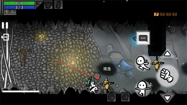 4、切换至攻击状态,对敌方单位发起攻击,清除障碍并继续探索洞穴。