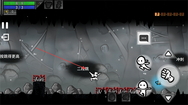 2、长按跳跃键实按跳得更高,触发二段跳,避开尖刺类障碍。