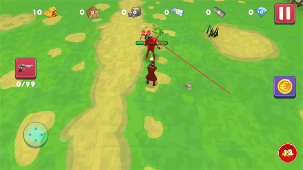 2、进入关卡后,通过左侧的方向控制按钮操控角色移动,同时可使用左侧的武器当前为手枪,收集路径上的资源来推进关卡。