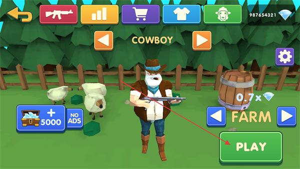 1、进入界面后,找到下方绿色的PLAY按钮并点击,即可进入游戏关卡,界面上方还有COWBOY、FARM等标识可后续进行对应操作。