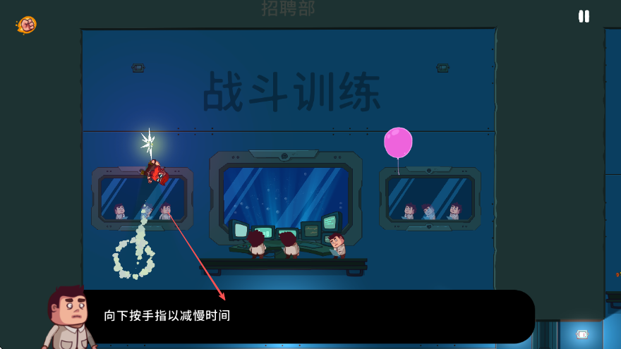3、遇到复杂场景需要跳跃抓取气球时,按提示向下按手指减慢时间,调整跳跃时机和方向。