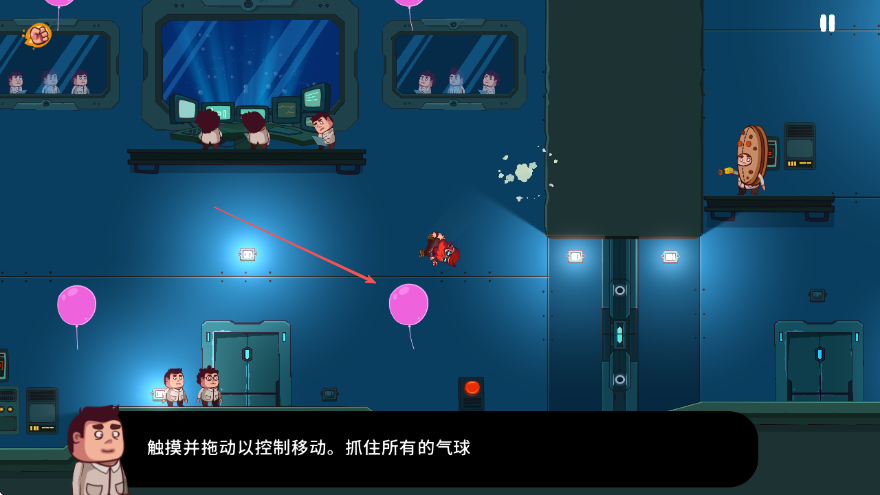 1、进入游戏,根据提示,触摸并拖动屏幕来操控红色角色移动,靠近粉色气球。
