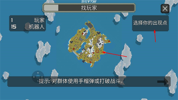 3、进入游戏前选择出现点,在地图中与其他玩家、机器人展开对战。
