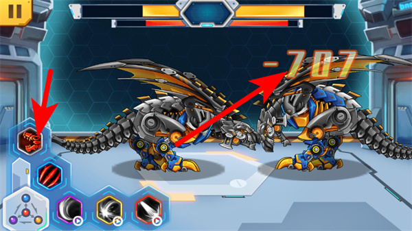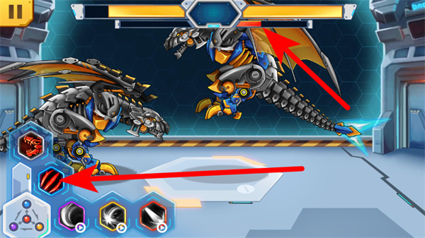 3、在机甲对战界面,观察上方进度条,点击左侧技能图标释放招式。