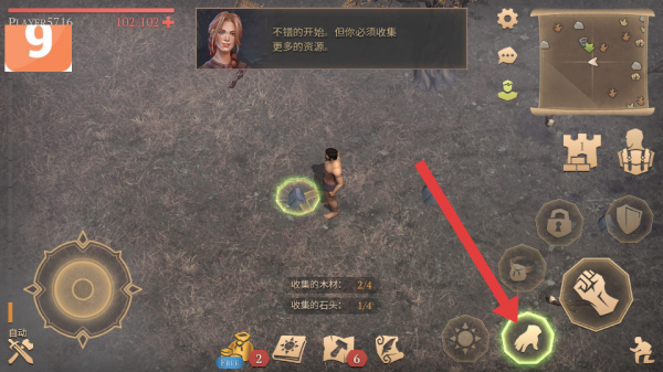 4、收集资源时,点击箭头指向的拾取手掌按钮,收集周围的木材、石头等资源,积累足够的资源用于制作工具、建造设施等。