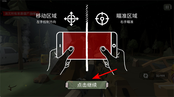 1、游戏开始时点击点击继续按钮,可进入战斗教程环节,这是熟悉操作方式的关键步骤,点击后需留意左右区域功能说明。