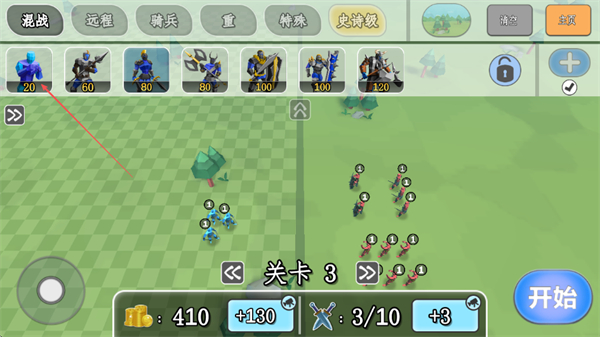 1、在兵种界面选择混战等类别兵种,消耗金币部署,点击开始进入关卡3战斗。