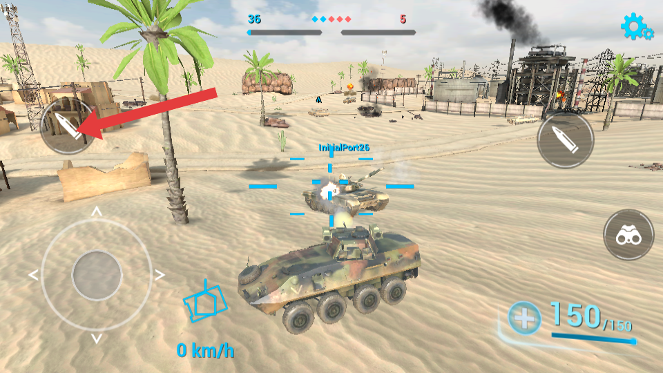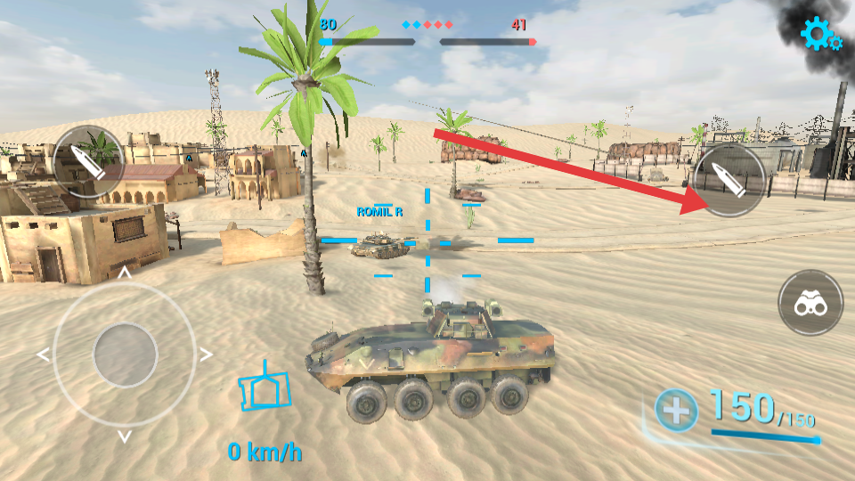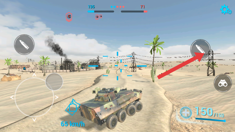 1、在沙漠战场中行驶时,熟悉箭头指向的弹药发射按键,一路寻找敌方战机的位置,并实时注意安全参与团队的战斗。