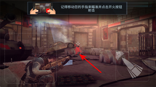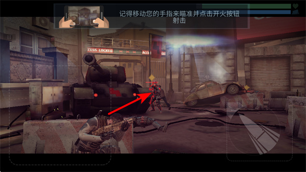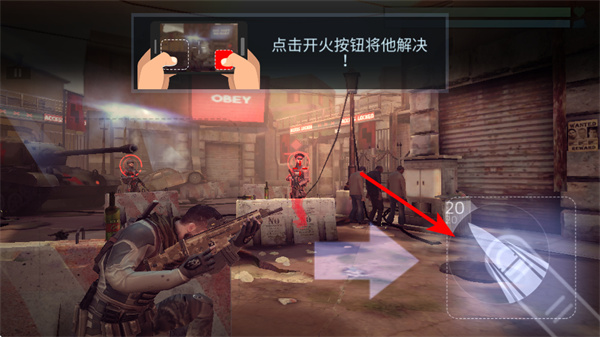 3、遇到不同位置的敌人时,移动手指来瞄准,再点击开火按钮射击,应对多样敌人分布。