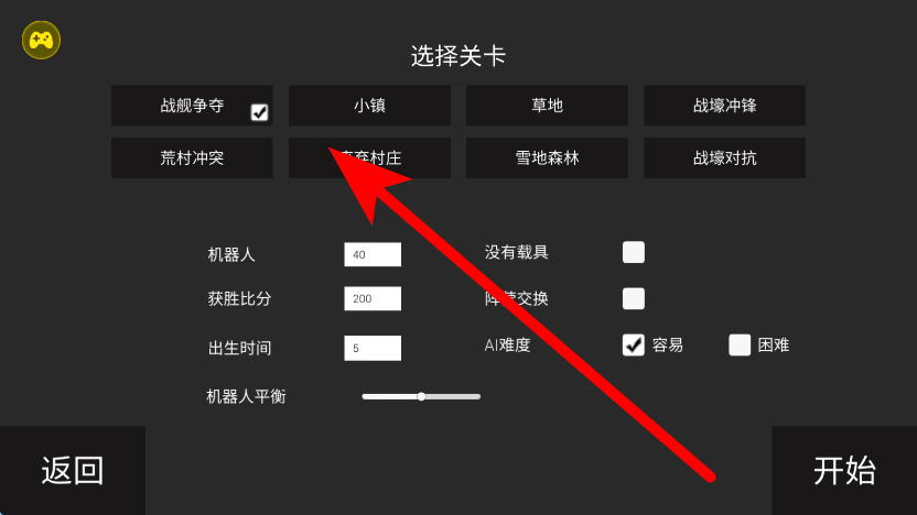 2、然后挑选关卡,在选择有战舰争夺小镇草地等多种关卡可选,选好心仪关卡后,还能设置机器人数量、获胜比分等参数,再点击开始。