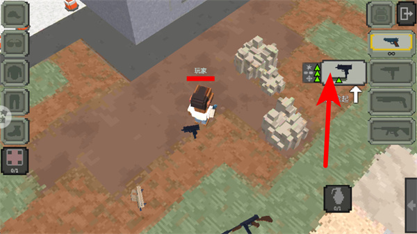 4、在战斗场景中,依照红色箭头指引,点击右侧的武器图标切换装如手枪,提升战斗能力以应对敌人。