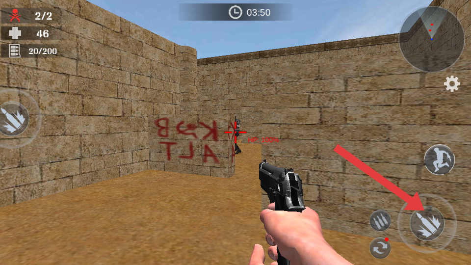 1、在场景中发现敌人时,点击箭头指向的射击按键,向敌人开火,利用手枪火力对其造成伤害,尝试击杀敌人。