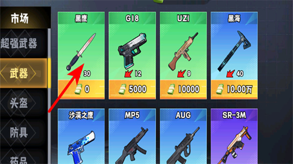 2、进入武器商店界面后,选择目标武器如黑鹰的匕首,这是提升战斗能力的基础操作,选定后可获取对应的武器装备,增强生存防御能力。