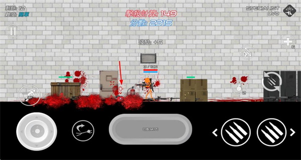 1、在战斗场景中,操控角色射击敌人,积累击杀计数和分数,提升游戏等级。