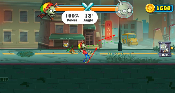 1、调整攻击的力量和角度,精准攻击敌方僵尸,发起战斗。