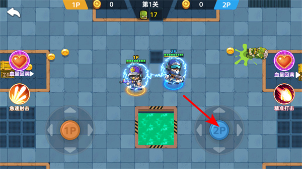 4、在战斗中,操控2P操作区域的摇杆,移动角色,与队友配合,共同击败敌人,完成目标。