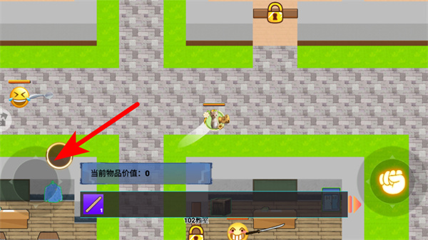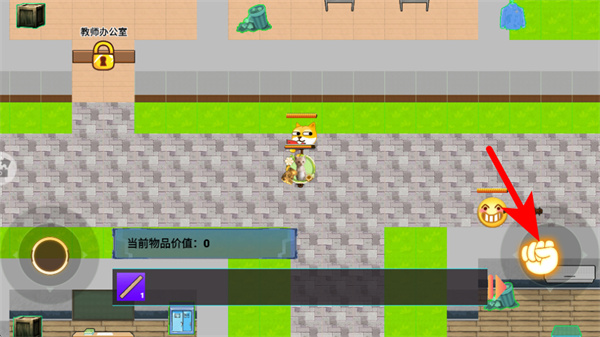 3、紧跟红色箭头指引,点击拳头按钮与场景物品互动如破坏、收集,提升物品价值,推进关卡的解压任务。