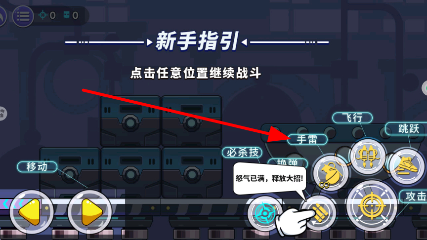 3、新手指引环节,会提示各种操作,比如移动靠左右箭头,还有手雷、必杀技等释放方式,怒气满时释放大招,能对敌人造成大量伤害,要留意指引学习操作。