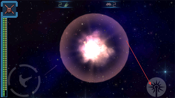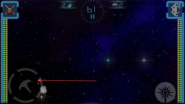 2、使用左侧虚拟摇杆操控飞船移动,在太空场景中躲避陨石,同时接近敌方单位。