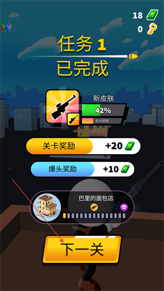 4、完成击杀任务,可以领取到关卡奖励以及新皮肤的解锁进度提升,点击下一关继续挑战。