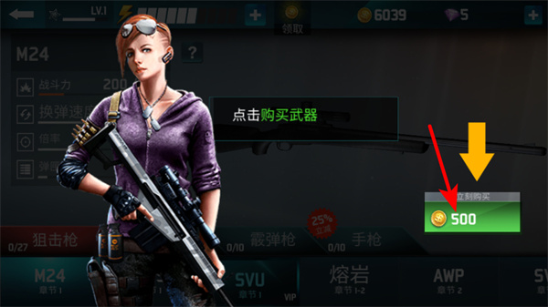 1、进入游戏后,点击武器库可购买趁手的武器如M24狙击枪,不同武器战力和属性不同。